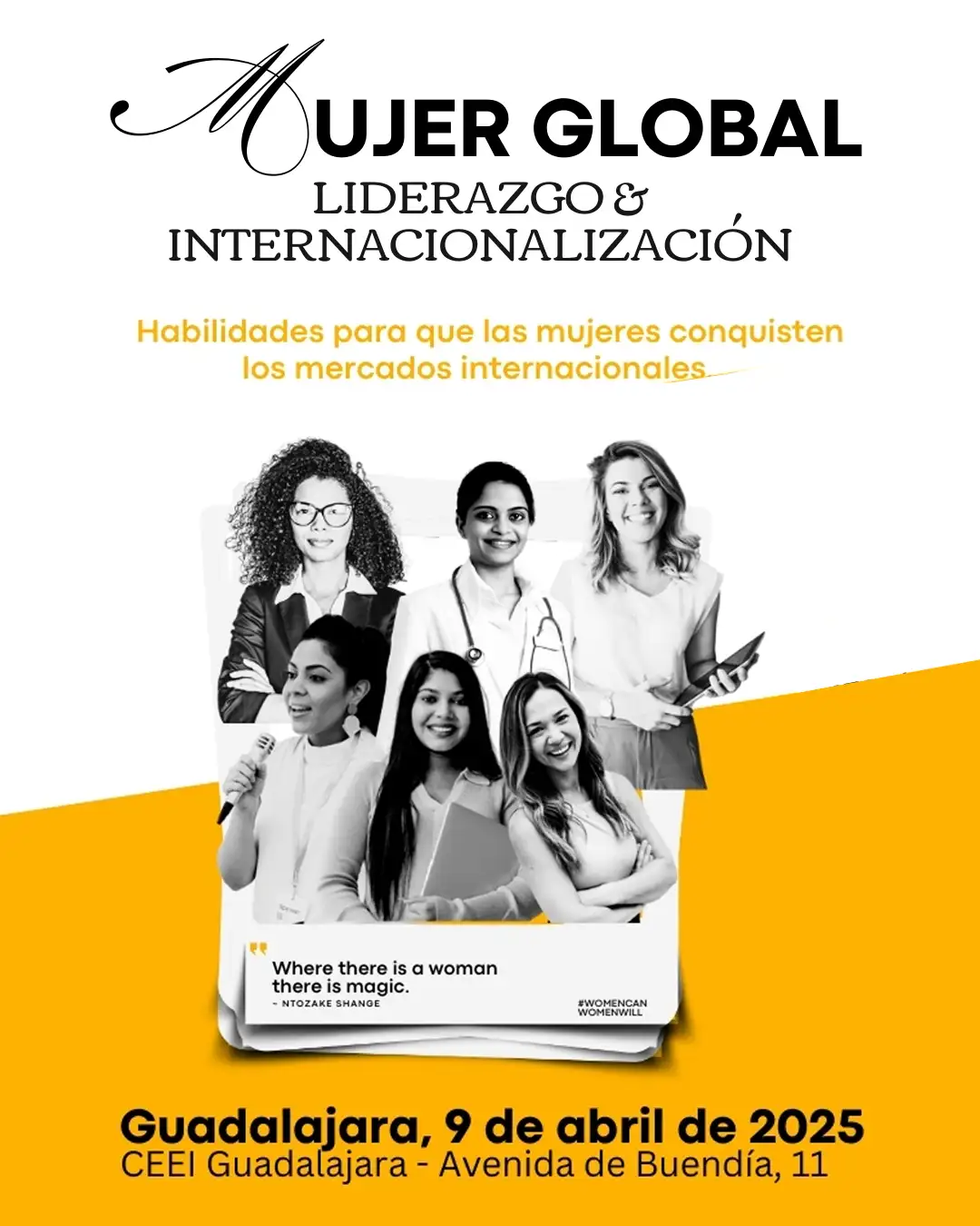 La Junta de Comunidades de Castilla-La Mancha, el IPEX y AJE Castilla-La Mancha, en colaboración con CEOE-CEPYME Guadalajara y CEEI Guadalajara, te invitan a un evento inspirador para potenciar el liderazgo femenino en los mercados internacionales.